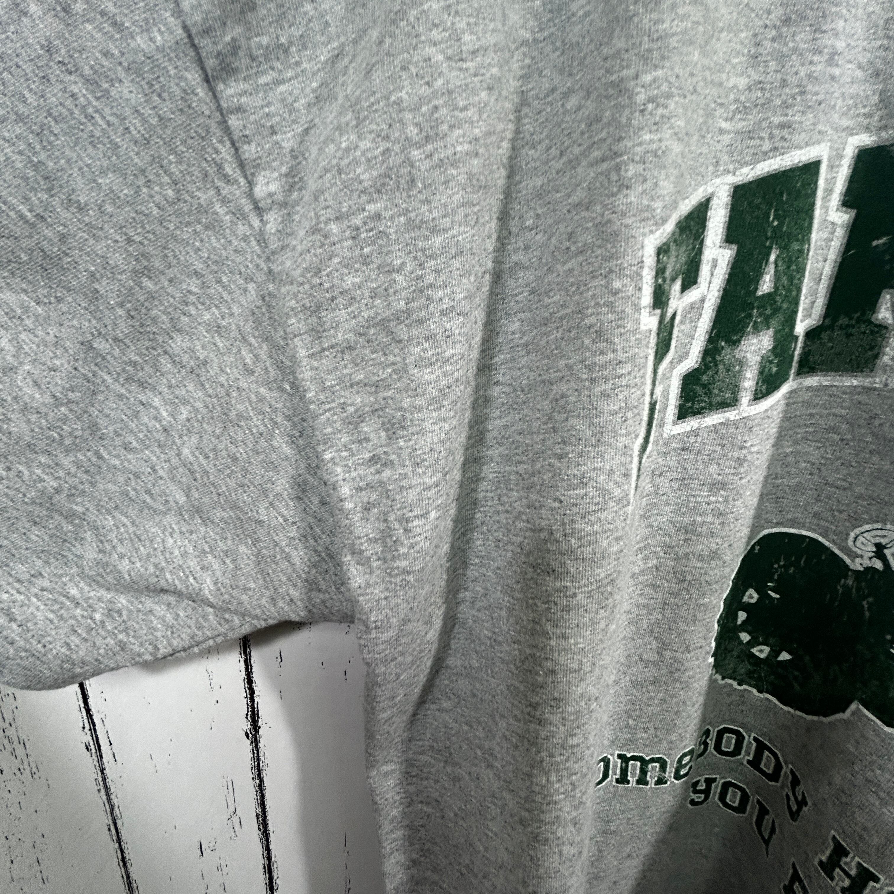 「somebody has to feed you peopl(誰かがあなたたちに食事を与えなければならない)」というメッセージが記されたグレーの古着Tシャツ。カレッジ風のデザインでカジュアルに着こなせる一品です。