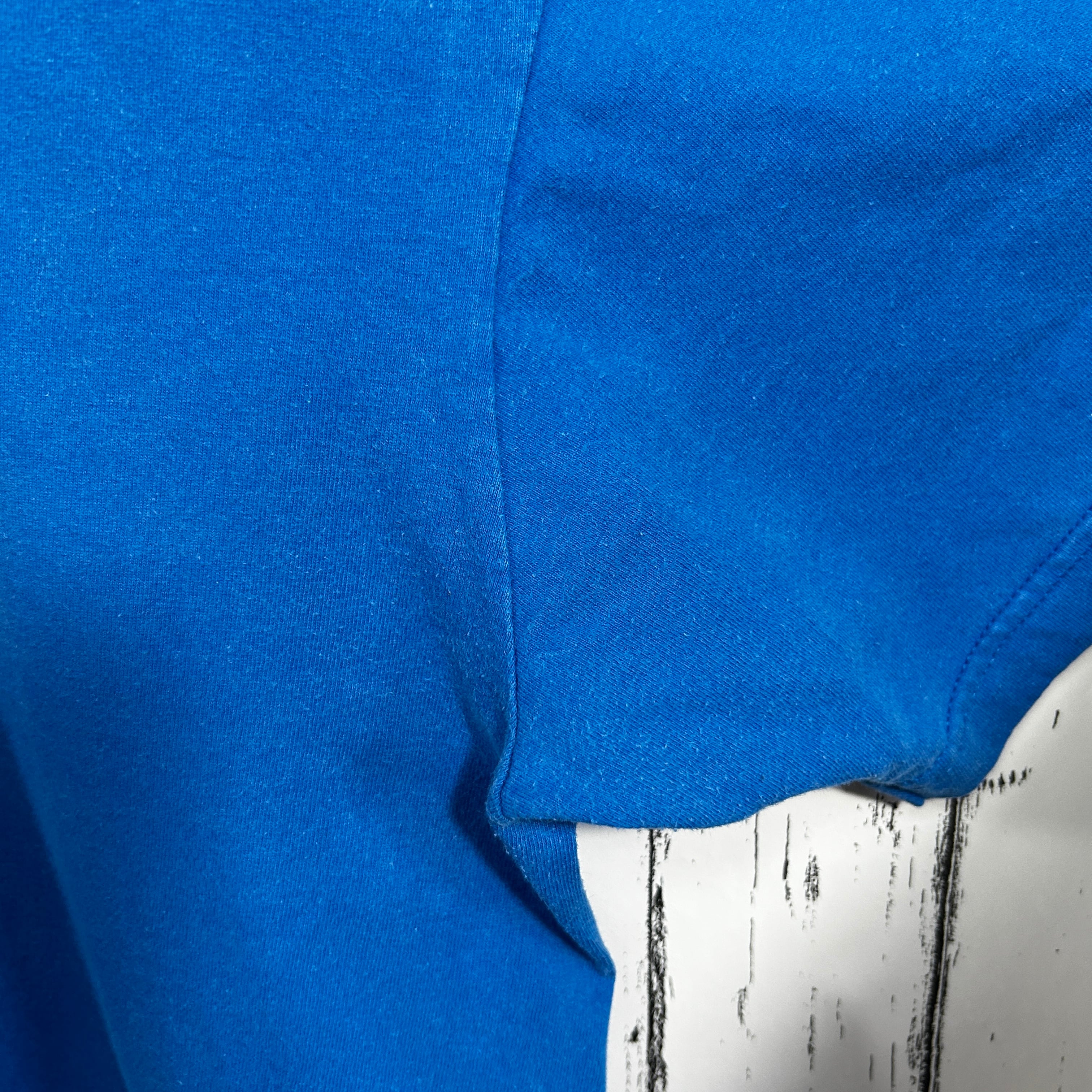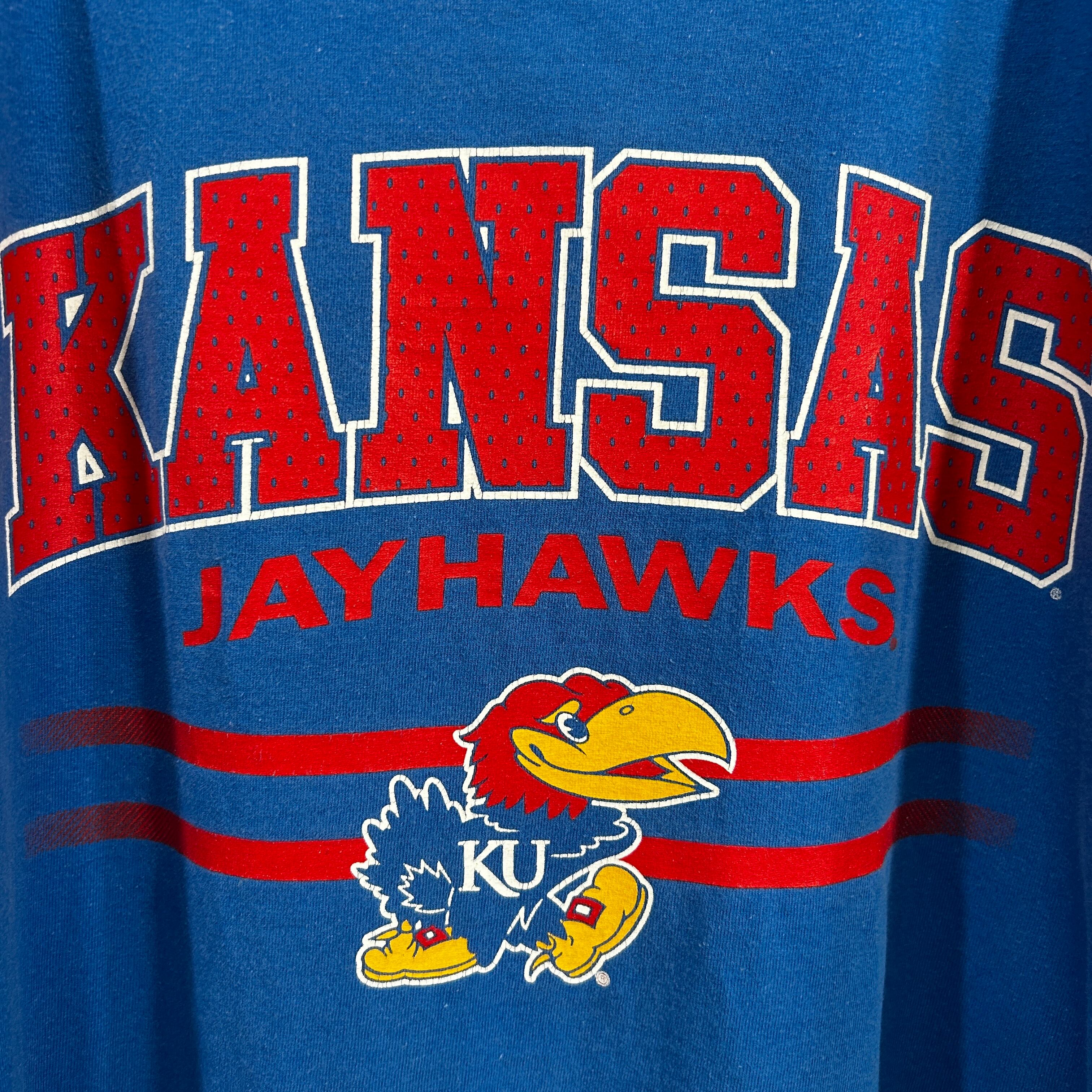『鮮やかなブルーのボディに、文字とチームキャラクターが大胆にデザインされたNCAA製の古着Tシャツです。カンザス大学のアイコニックなマスコット「Jayhawk」が描かれており、スポーティーでカジュアルな印象を演出。90s〜00sのアメカジやストリートスタイルに馴染む、存在感のある一点ものです』