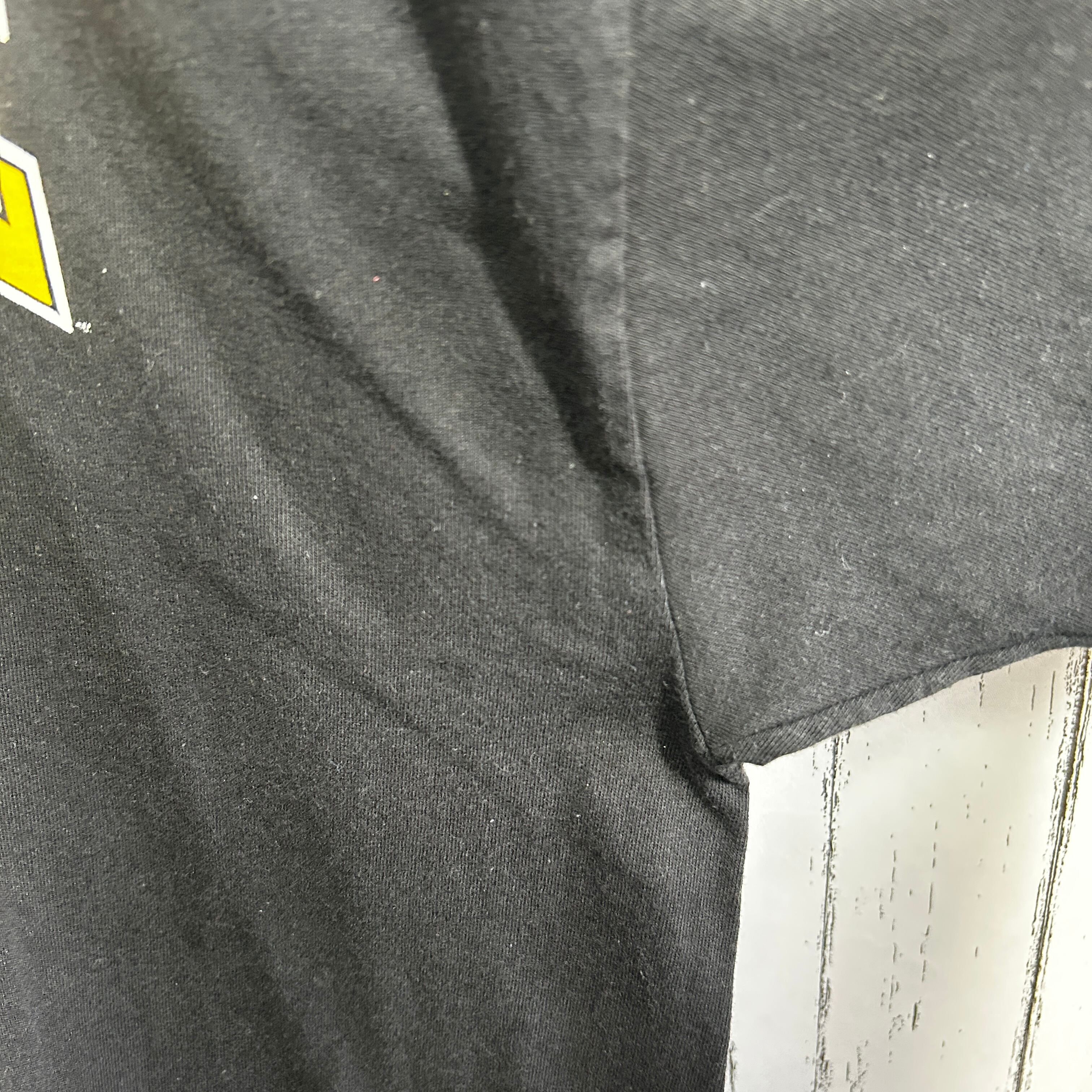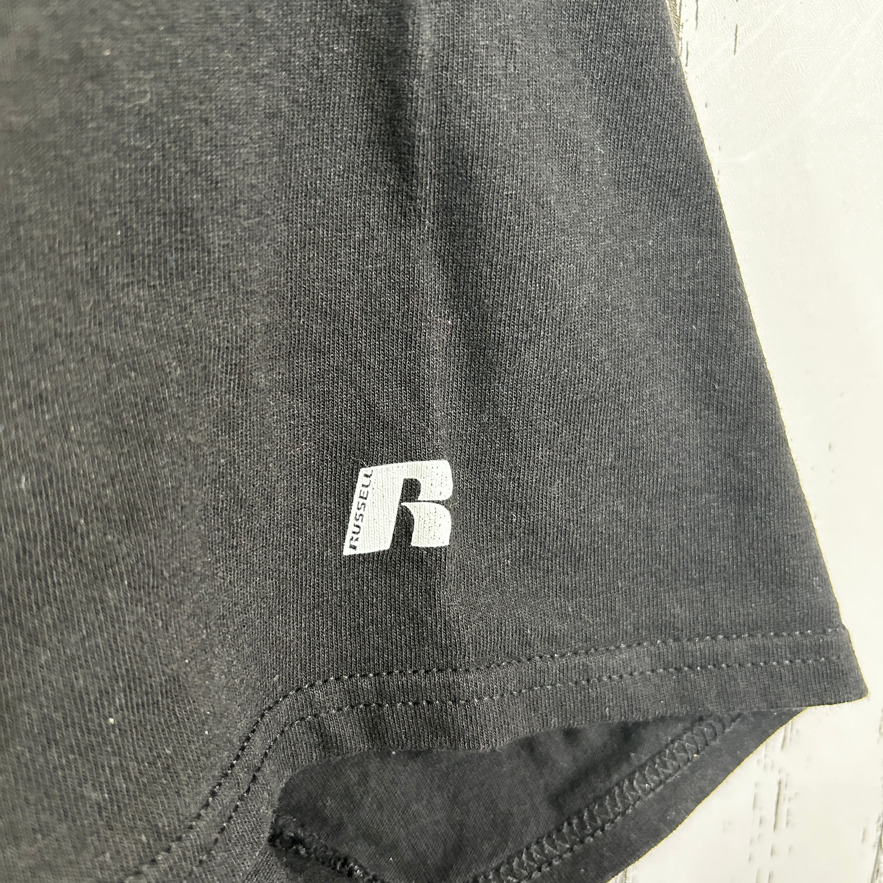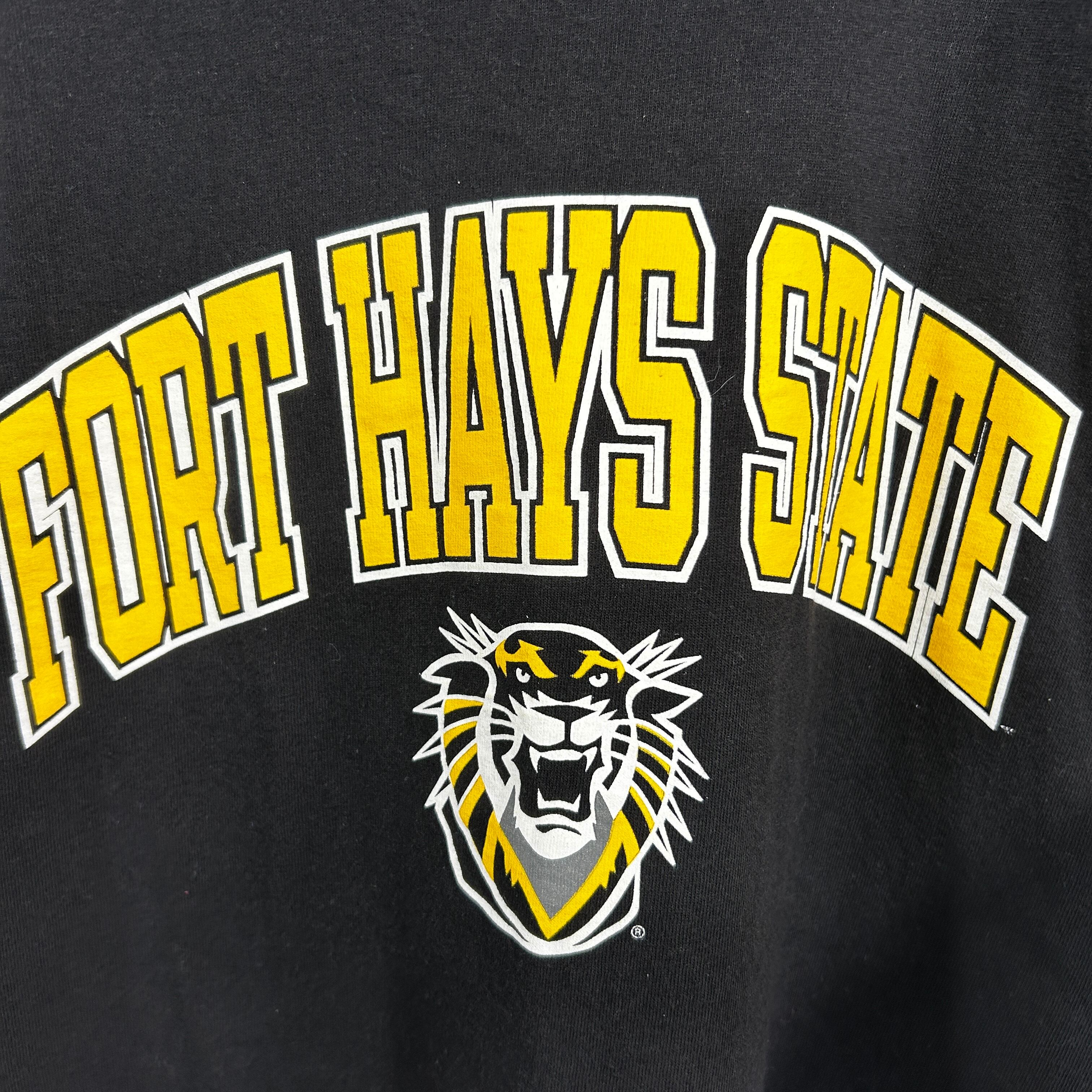 『クラシックなブラックボディに、アーチ型の「FORT HAYS STATE(フォートヘイズ州立大学)」ロゴと虎のキャラクターをあしらったラッセル製の古着カレッジTシャツです。袖にはブランドロゴの「R」がさりげなくプリントされ、古き良きカレッジスタイルの雰囲気を引き立てています。90s〜00sのアメカジやストリートコーデに自然に馴染む一点もので、カレッジファンや古着好きのワードローブにおすすめです』