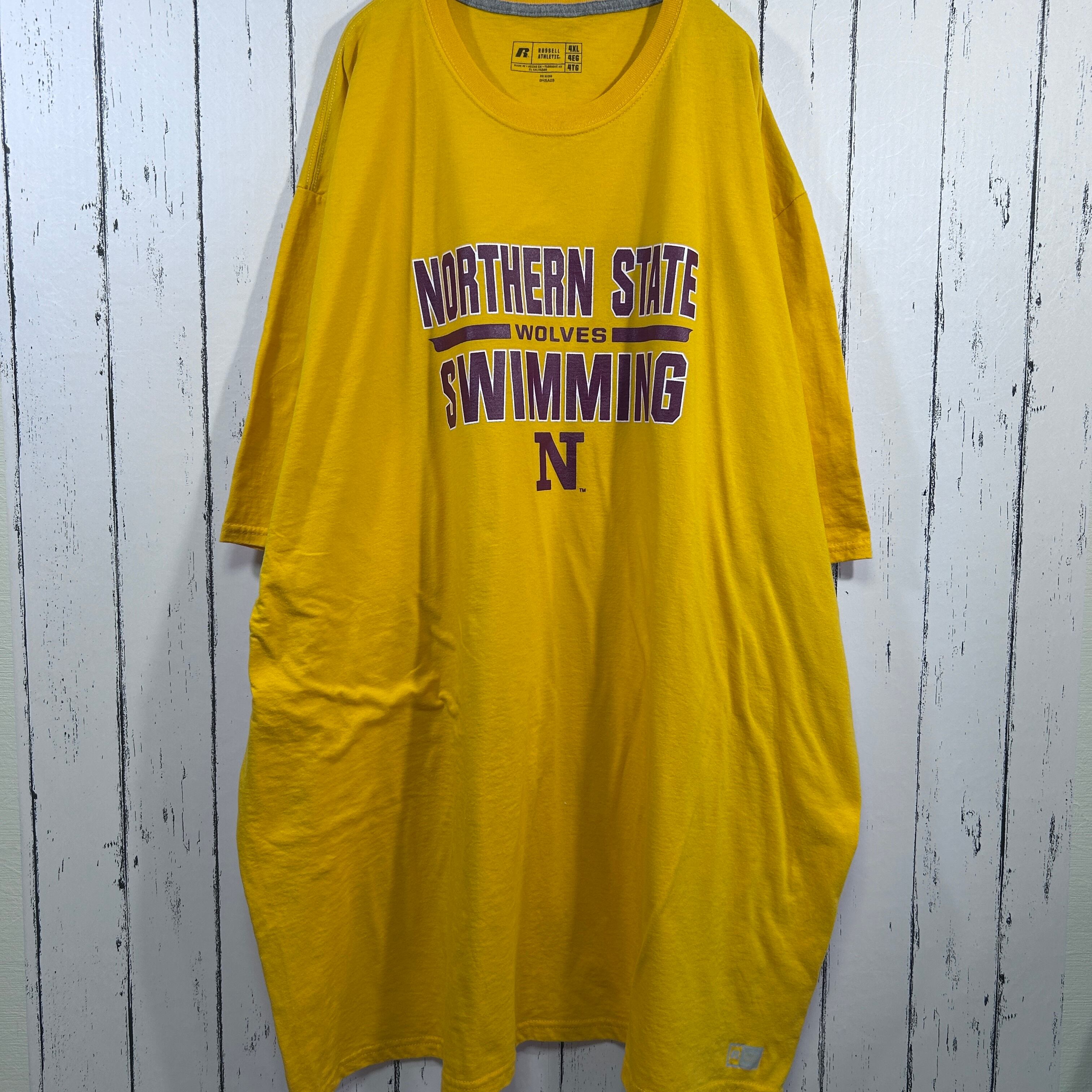 『サウスダコタ州にあるノーザンステート大学(Northern State University)のスイミングチームを象徴する、カレッジスピリットあふれる古着Tシャツ。RUSSELL製のボディを使用し、程よく着込まれた風合いが古着ならではの味わいを演出しています。珍しいビッグサイズ/オーバーサイズの4XLで、スポーツMIXやアメカジスタイルに取り入れやすいおすすめの一枚です』