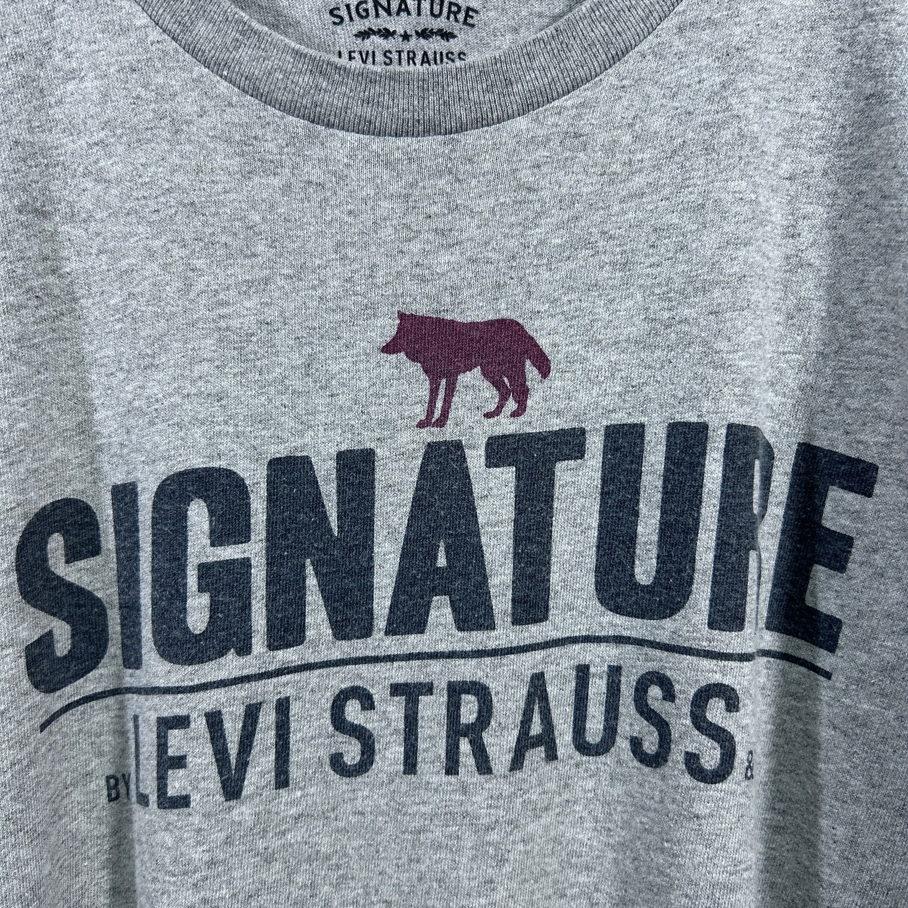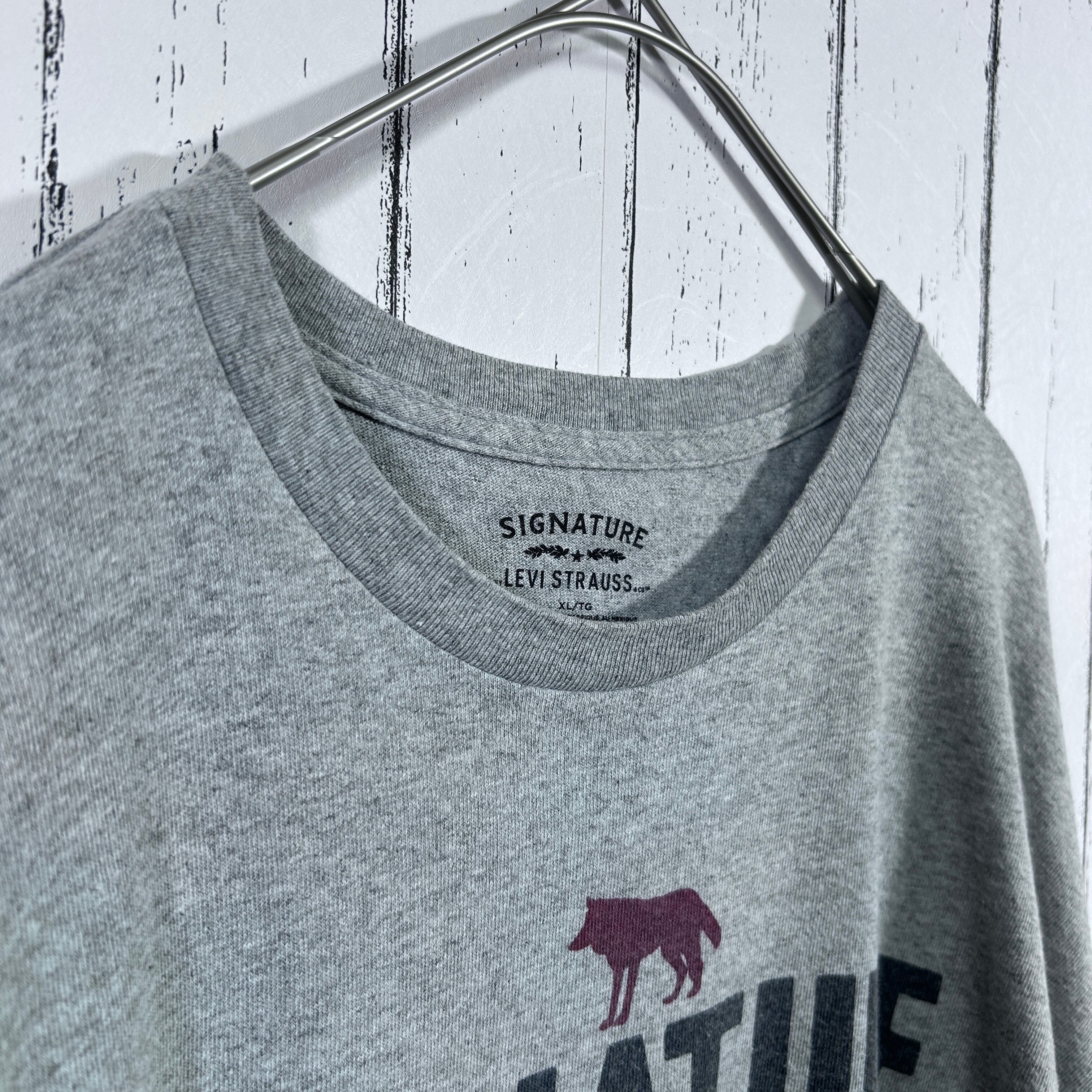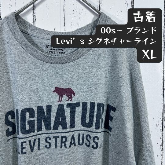 『Levi’sの派生ライン「SIGNATURE」より、メキシコ製の古着Tシャツ。グレーボディに「SIGNATURE BY LEVI STRAUSS & CO」と狼(またはコヨーテ)のシルエットがプリントされた一枚です。2000年代らしい雰囲気が漂うXLサイズで、ゆったり着こなせるアイテム』