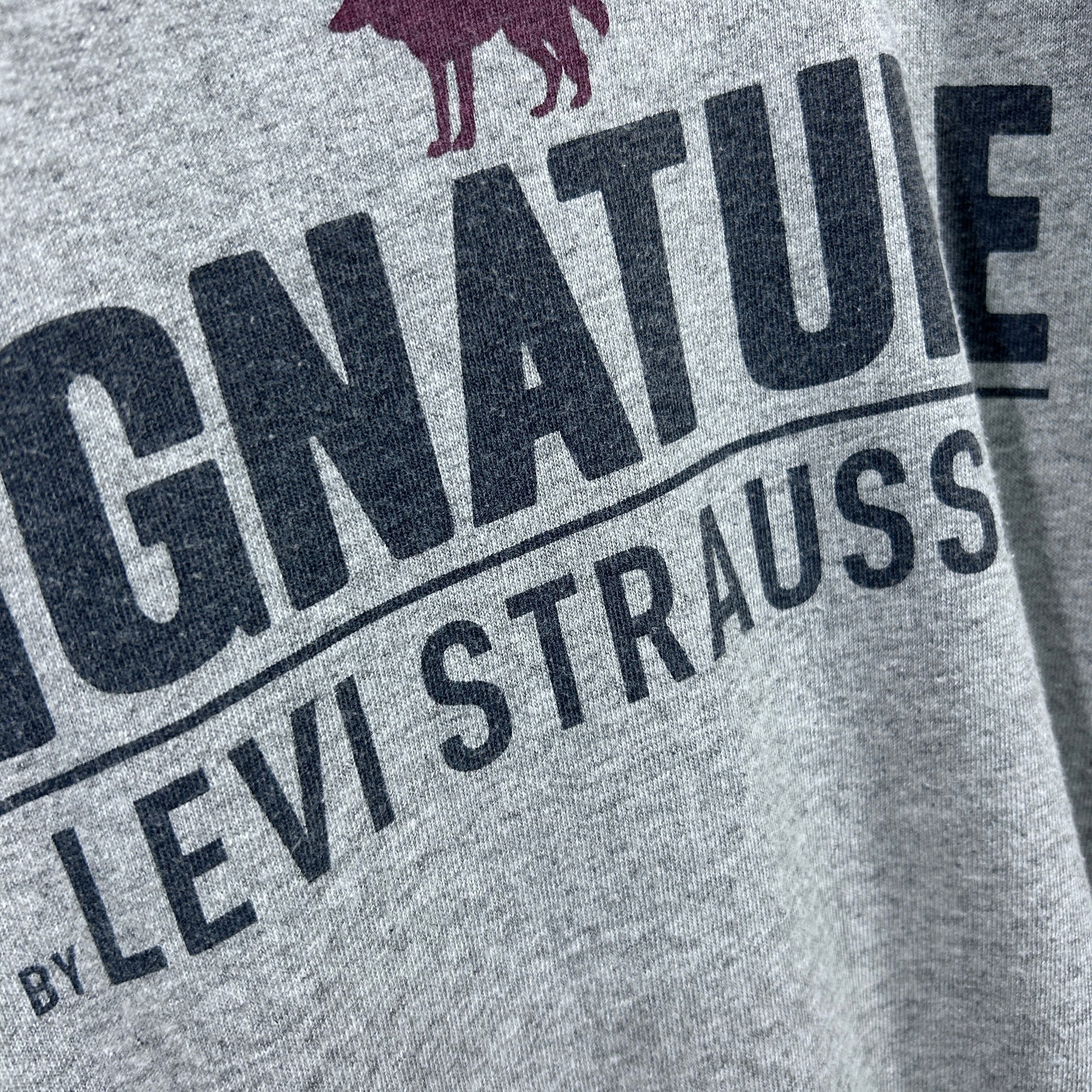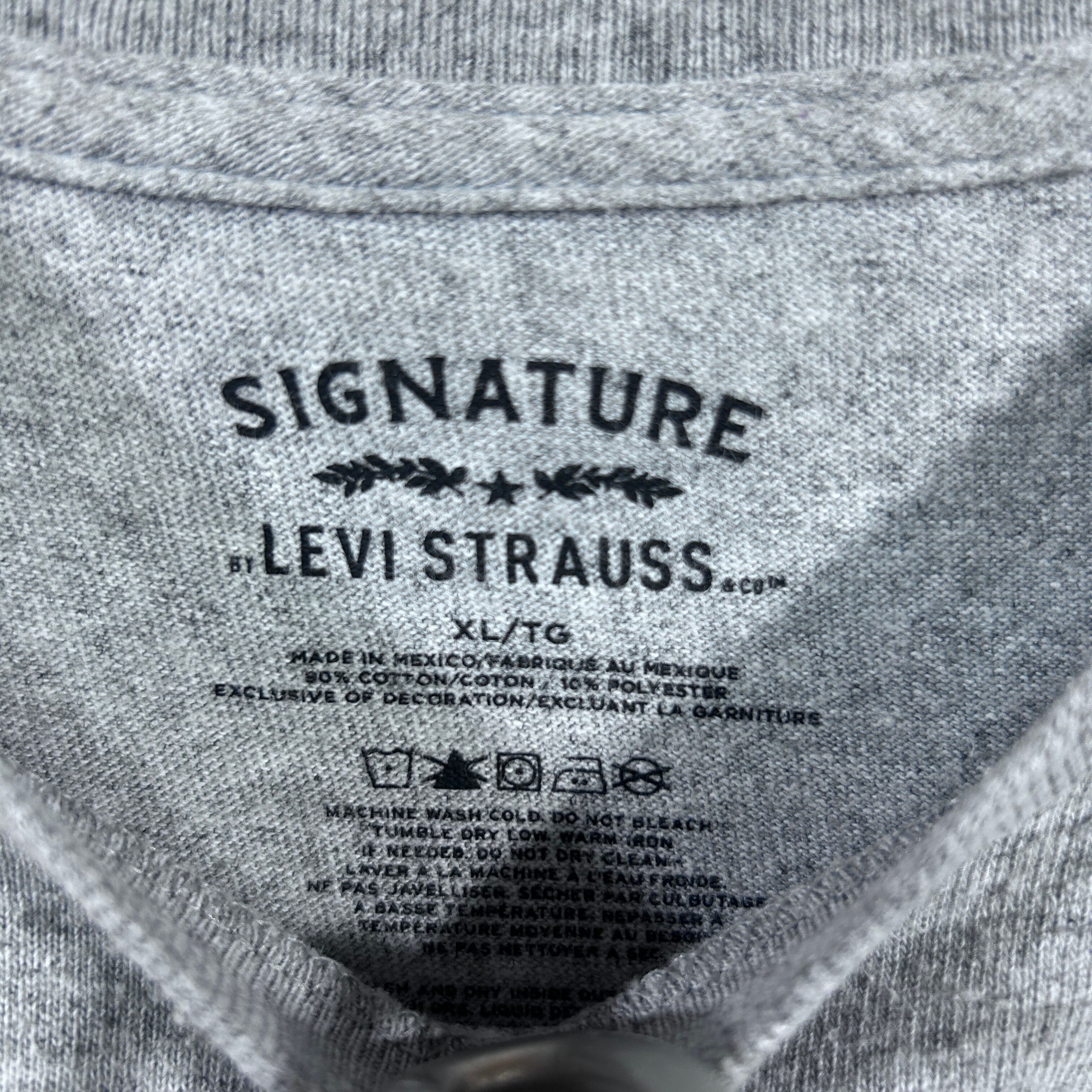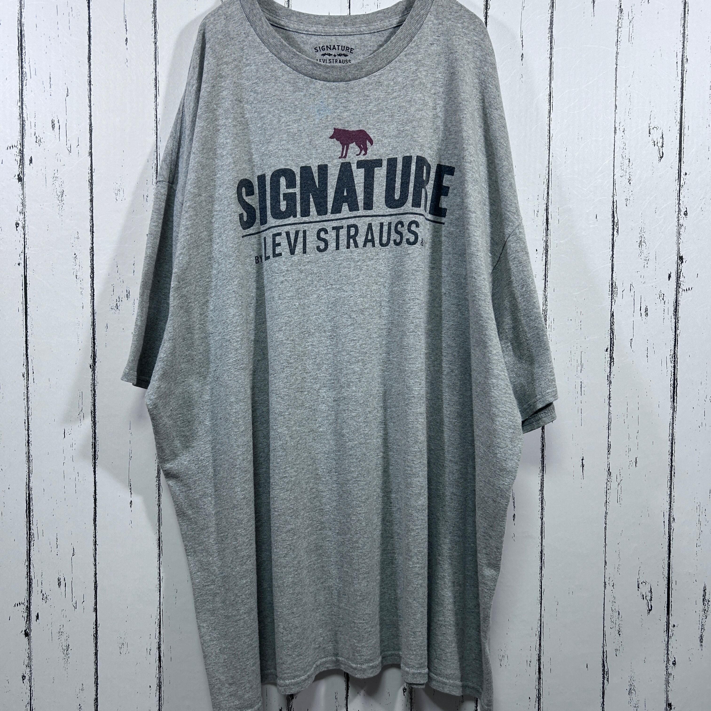 『Levi’sの派生ライン「SIGNATURE」より、メキシコ製の古着Tシャツ。グレーボディに「SIGNATURE BY LEVI STRAUSS & CO」と狼(またはコヨーテ)のシルエットがプリントされた一枚です。2000年代らしい雰囲気が漂うXLサイズで、ゆったり着こなせるアイテム』