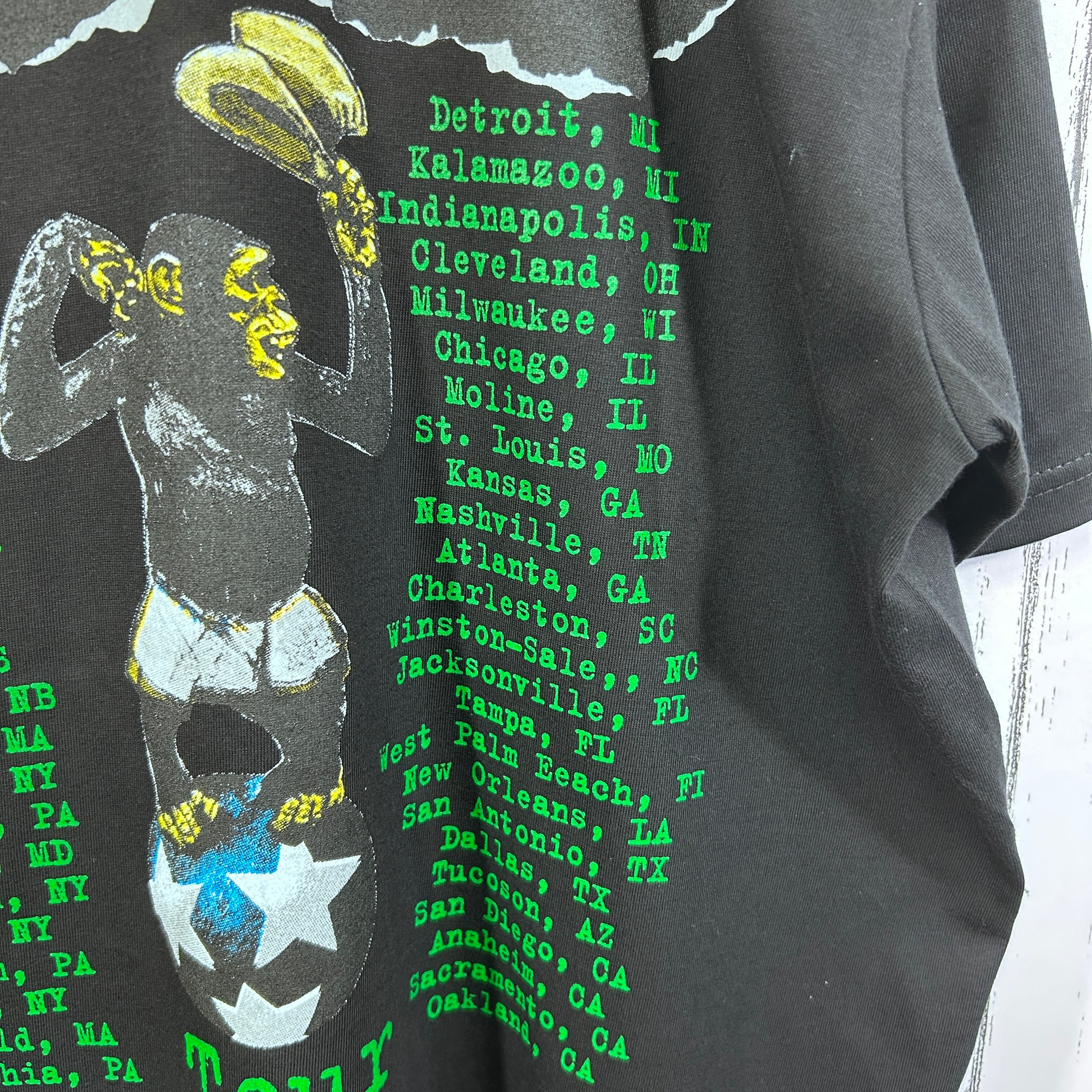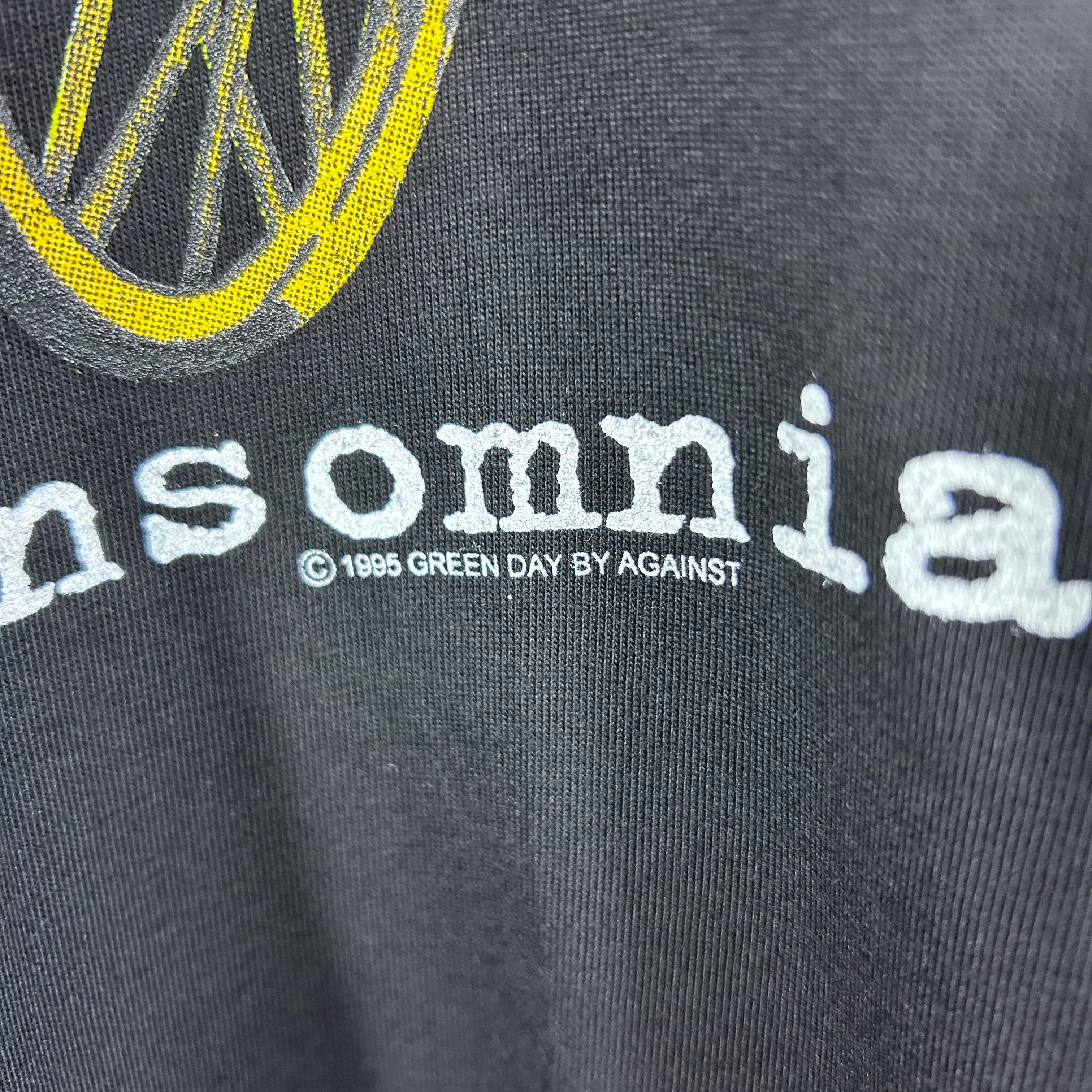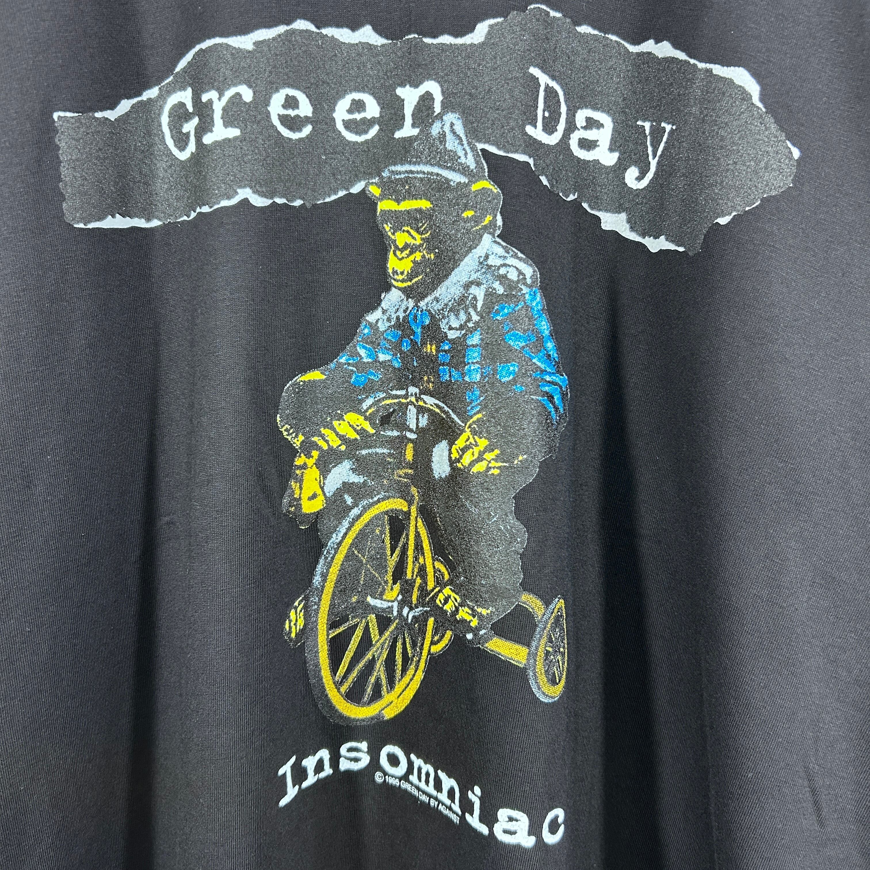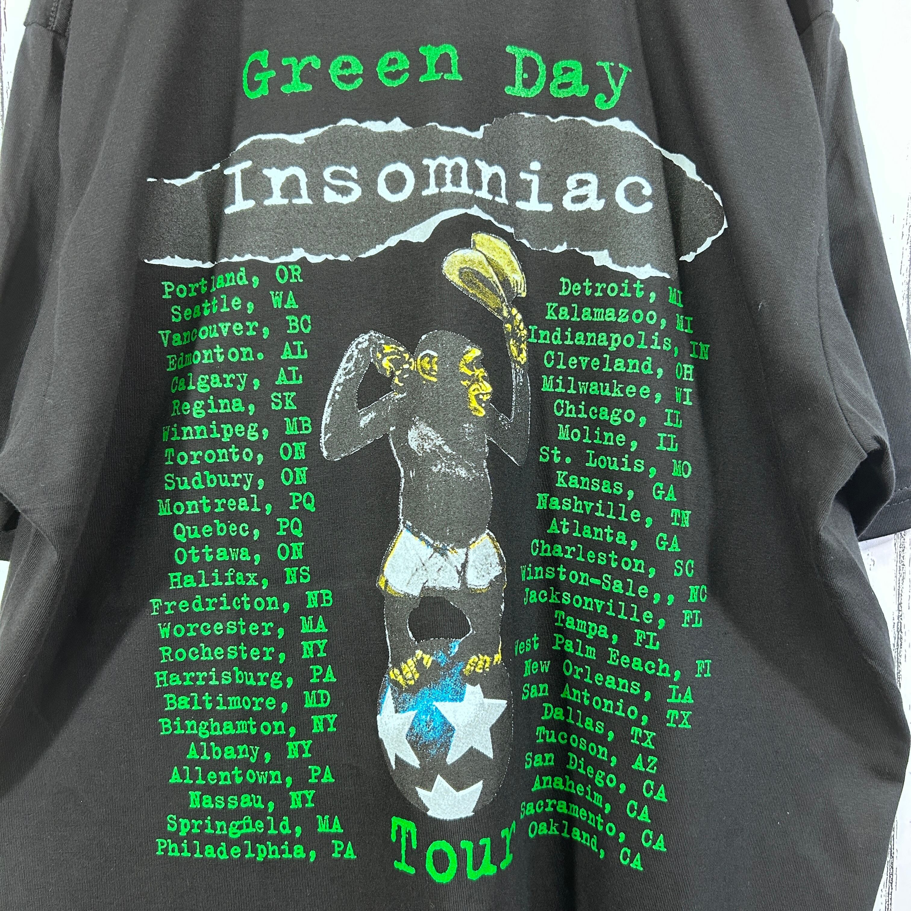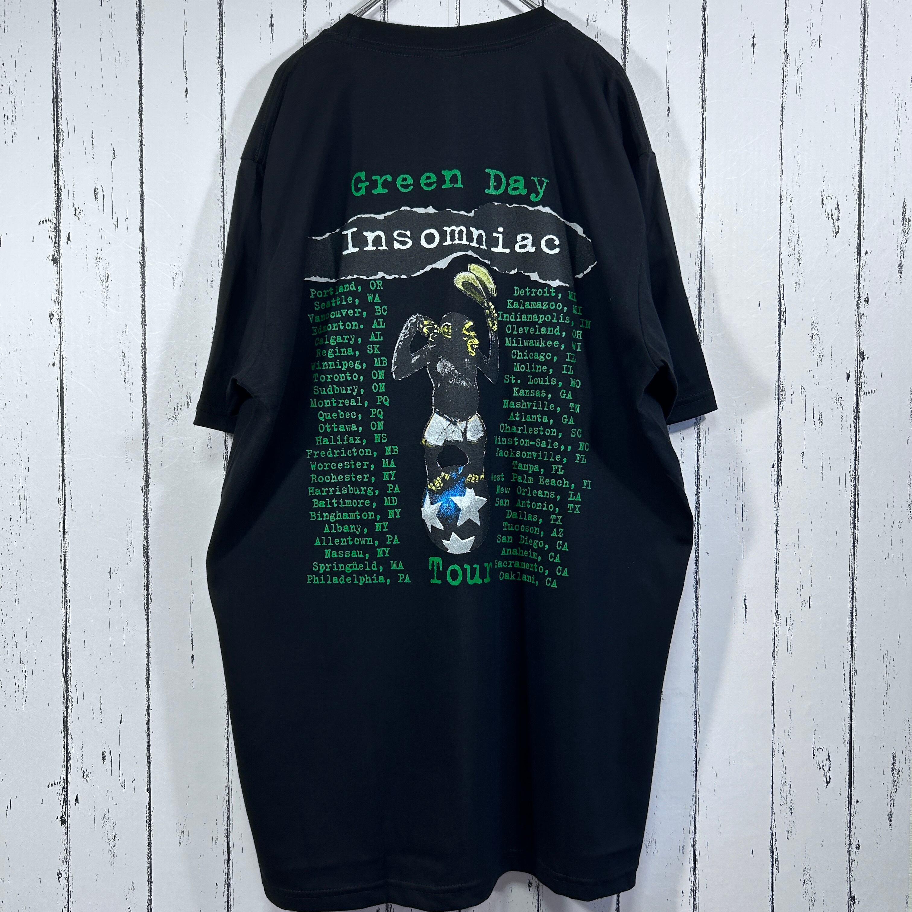 『90年代を代表するパンクロックバンド Green Day。アルバムInsomniac(1995年)」は、疾走感あるサウンドとダークなアートワークで当時のファンを魅了しました。こちらはそのツアーTシャツをタイの against がリプリントした1枚。ブラックボディに両面プリントで存在感抜群です。サイズは人気のXLで、ゆったりとしたストリートコーデやライブ・フェスシーンにぴったり。ヴィンテージまでは手が届かないけれど、雰囲気を気軽に楽しみたい方におすすめです』
