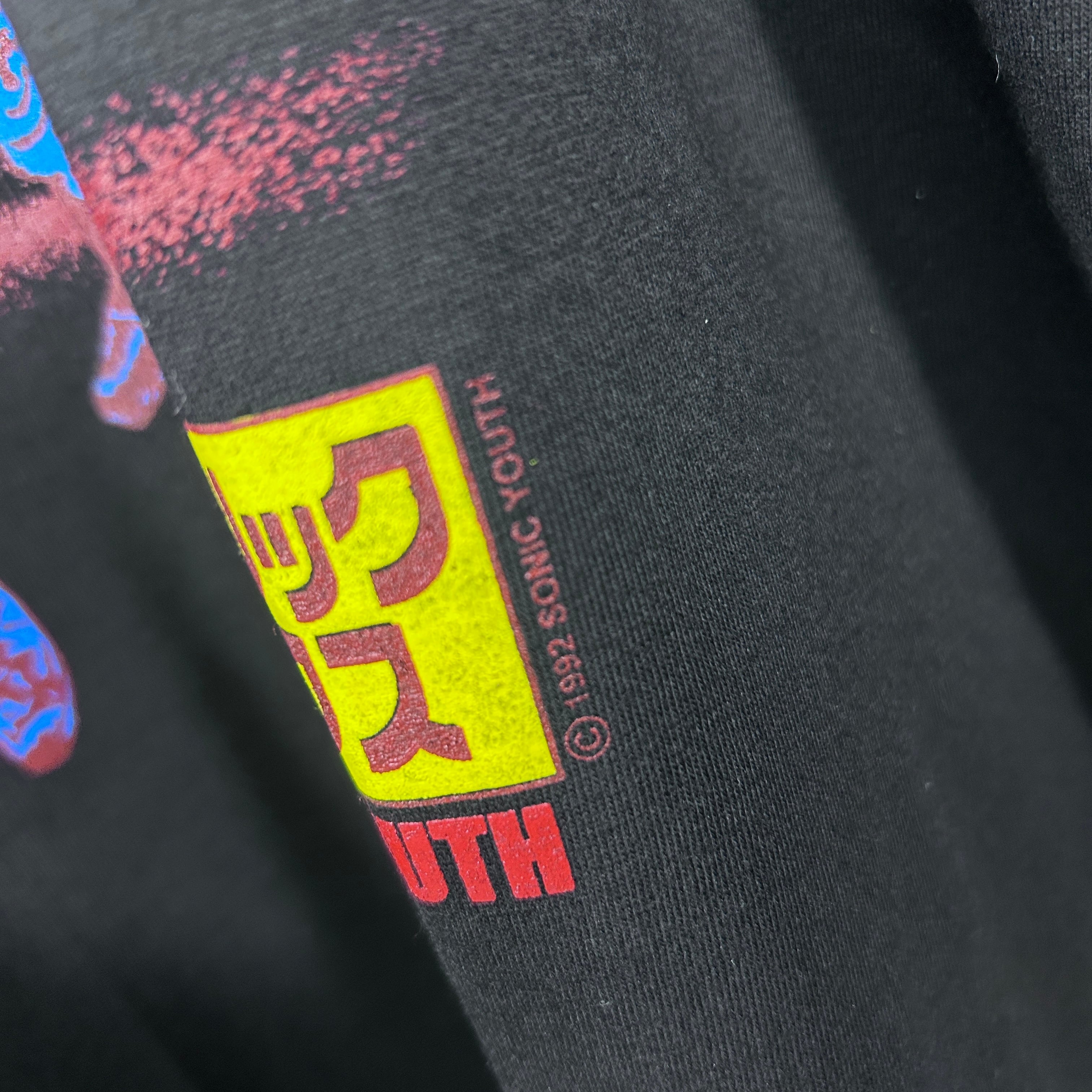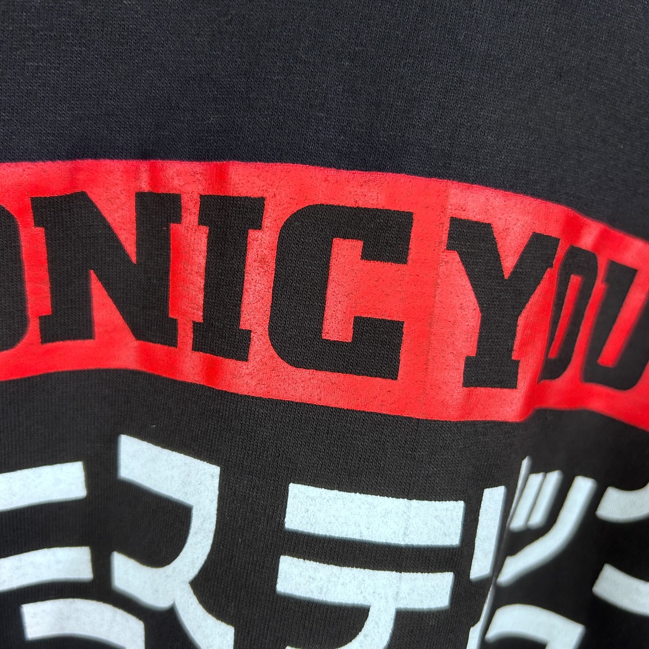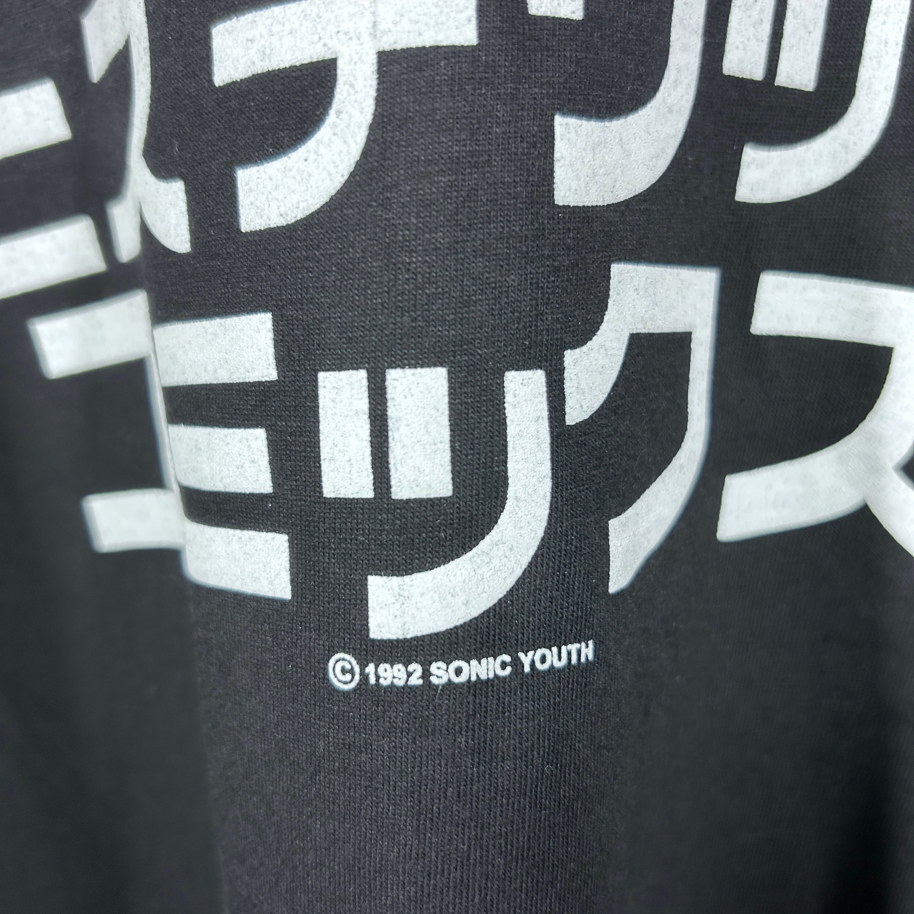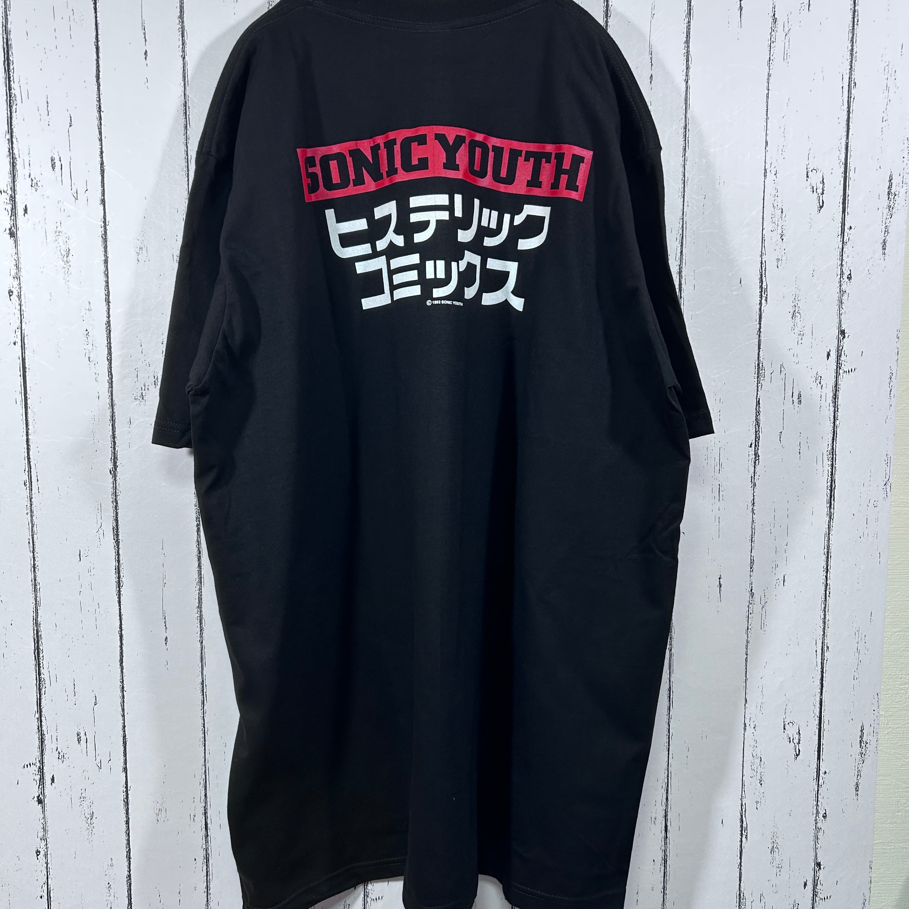『後のグランジ、オルタナティヴ・ロックムーヴメントへ大きな影響を与えたアメリカのバンド「Sonic Youth(ソニックユース)」の個性的なデザインを採用したバンドTシャツ。無敵戦隊やヒステリックコミックスなど、漢字やカタカナが使用されたプリントが特徴です』