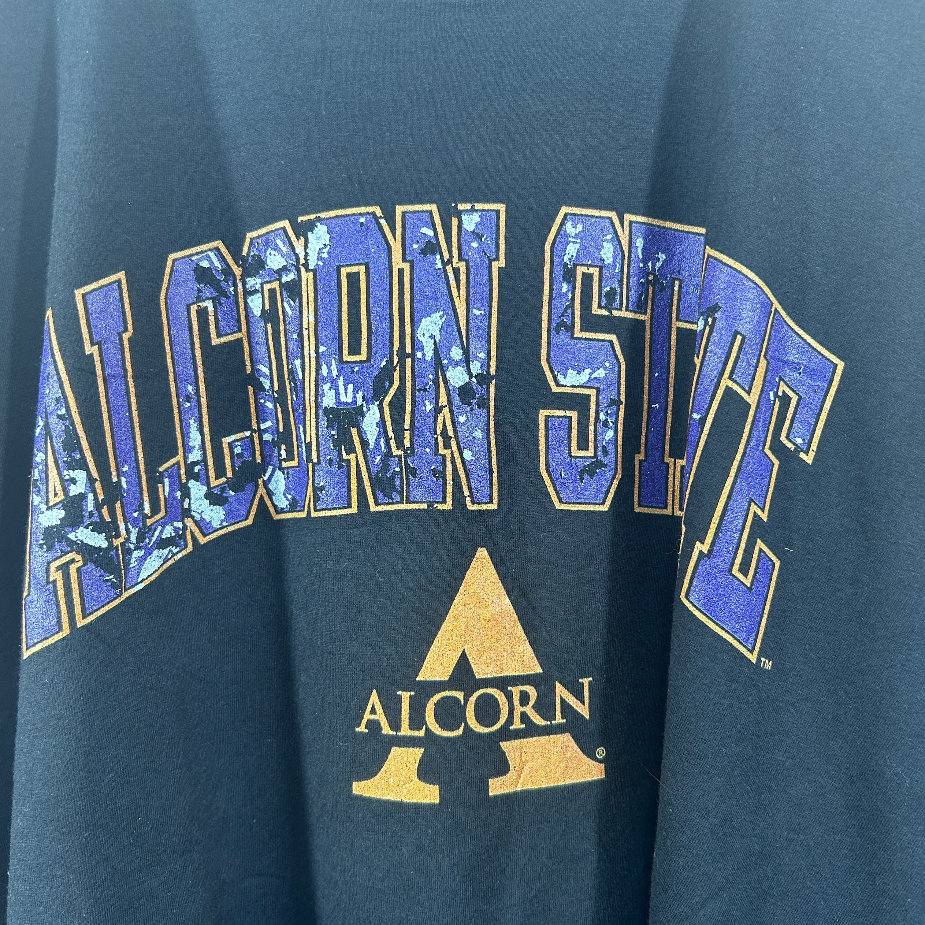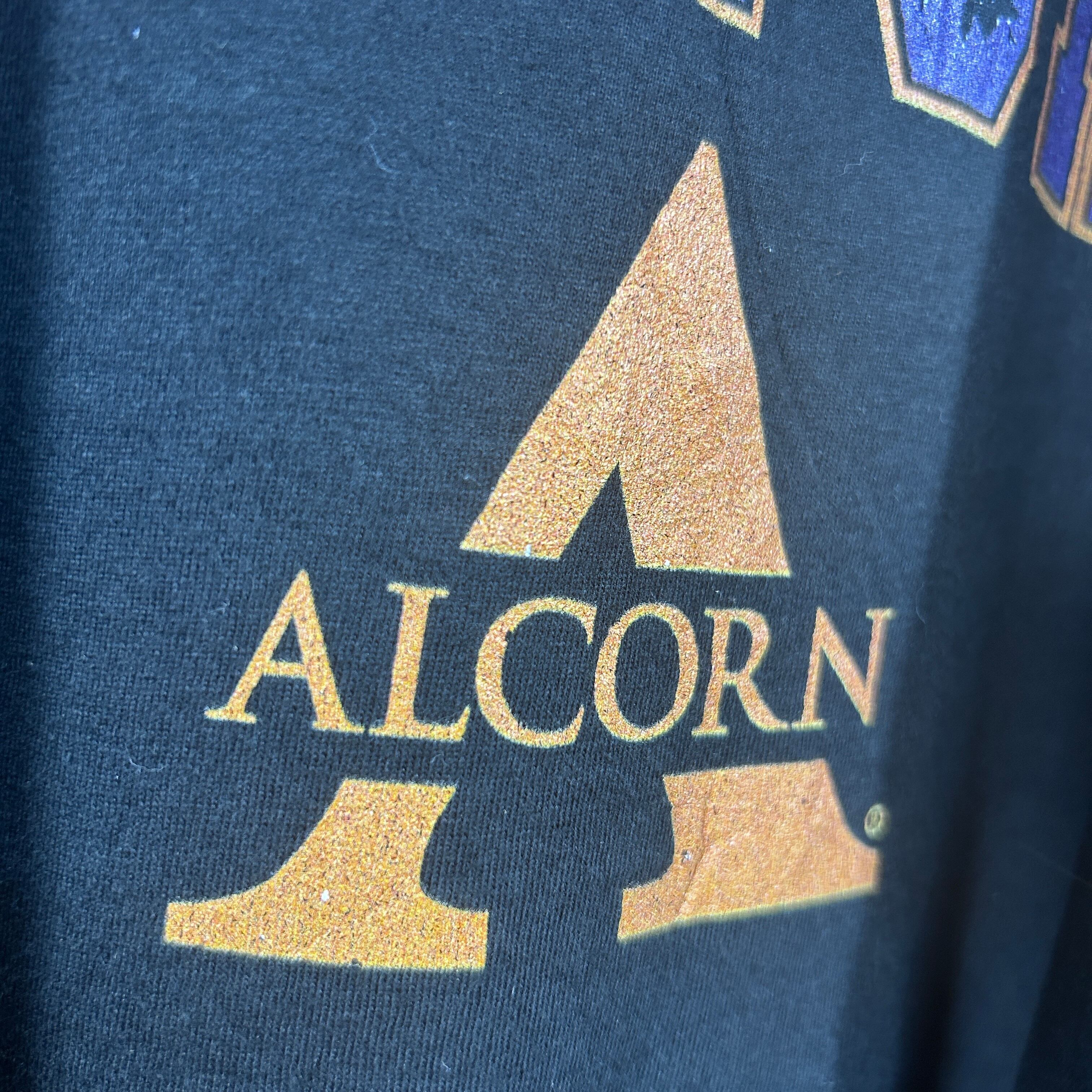 『アフリカ系アメリカ人を受け入れる最初の州立大学として歴史を刻んできた**アルコーン大学(ALCORN STATE)**の精神を体現した一枚。胸には象徴的な「A」の文字と大学名がプリントされ、カレッジ文化と誇りを感じさせるデザインです。シンプルながらも歴史的背景が息づく古着Tシャツで、着るだけで学びや尊敬の気持ちを表現できるアイテムです』