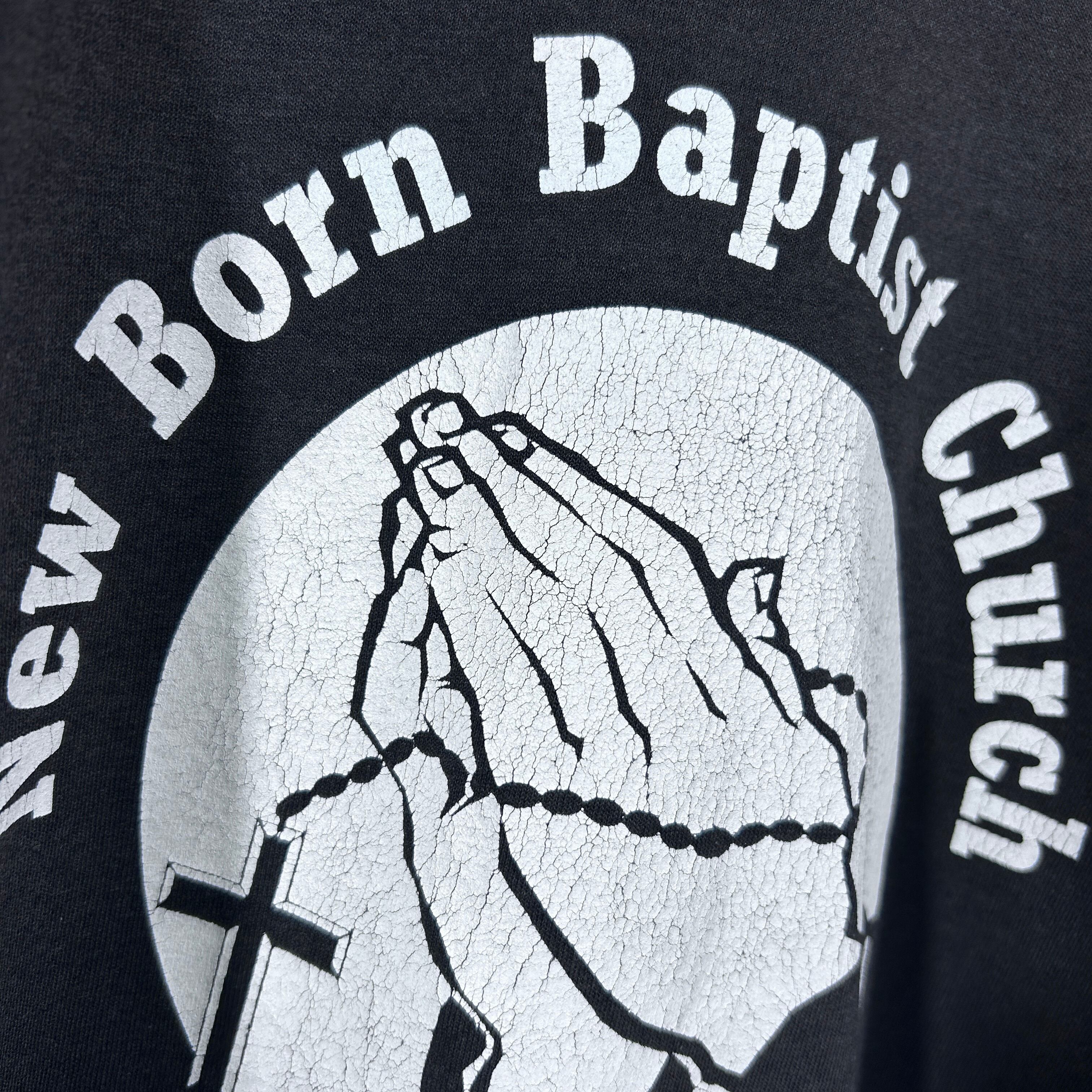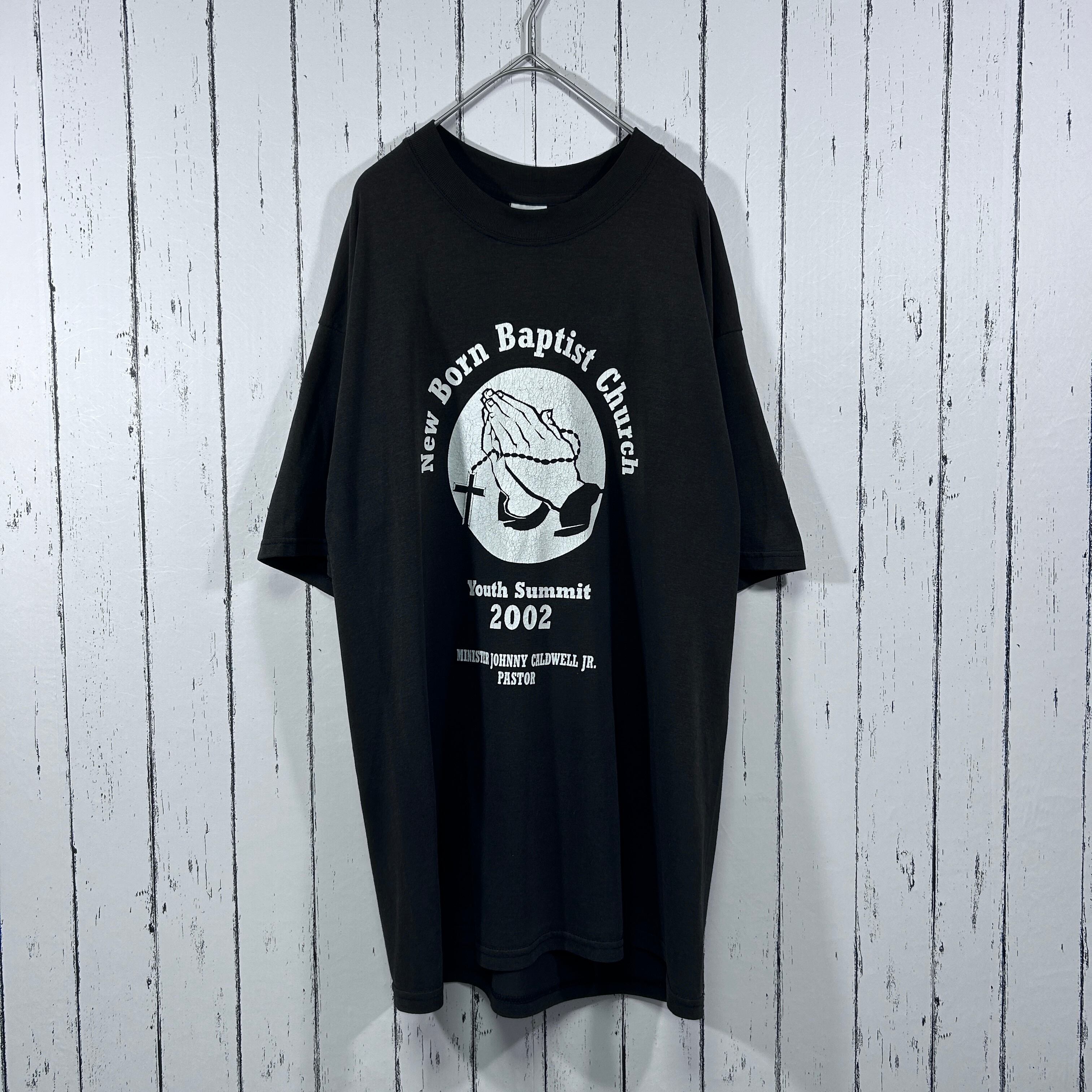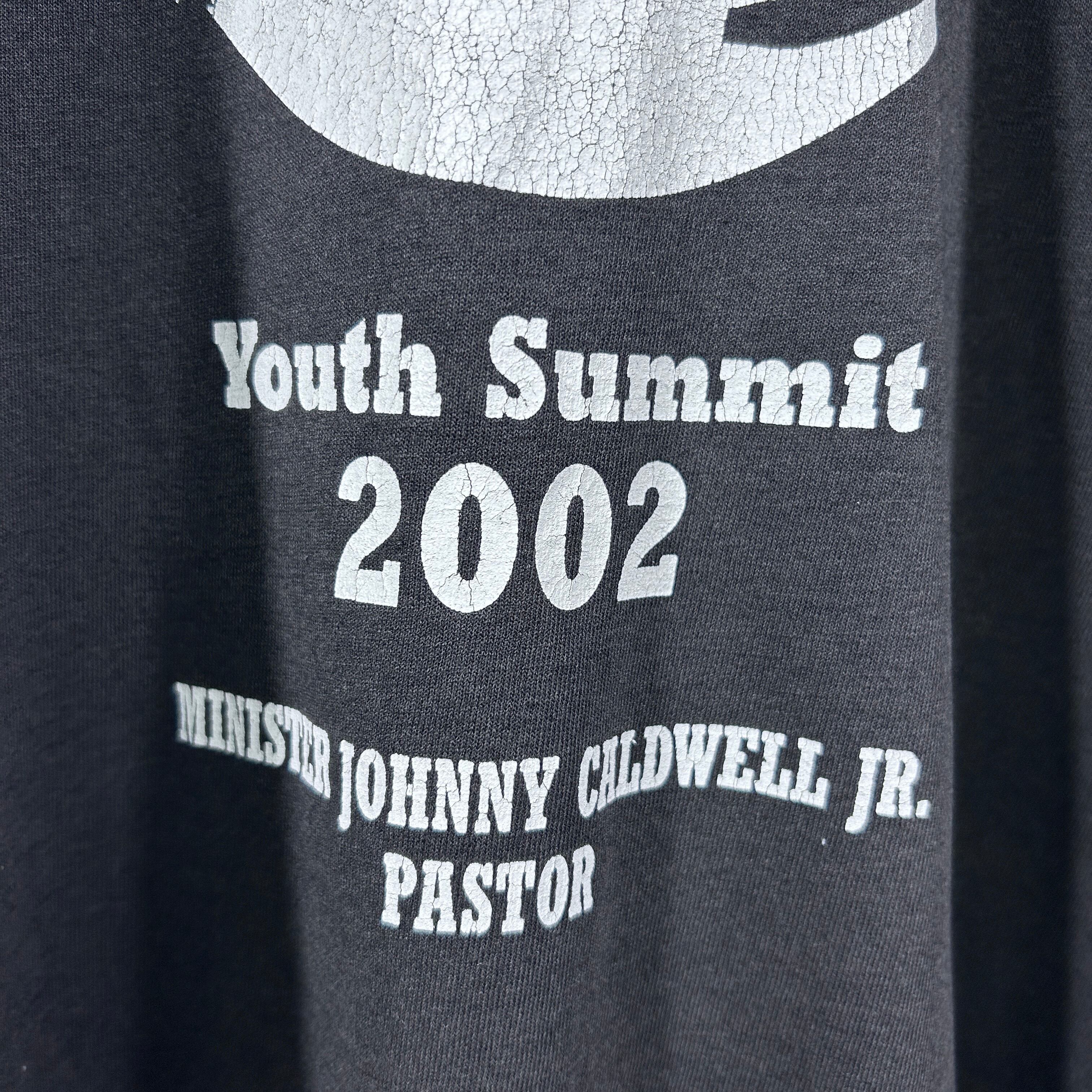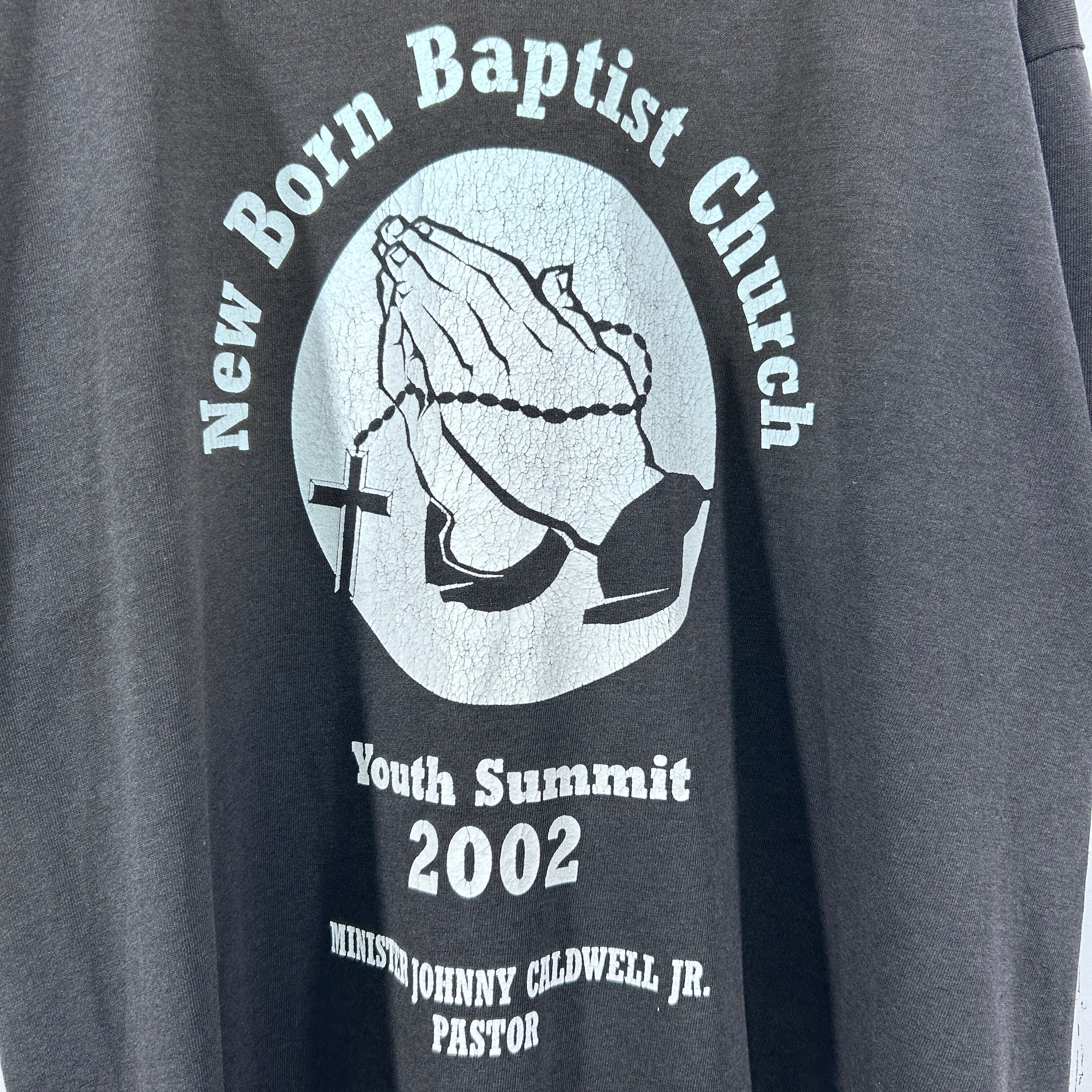 『2002年にニューボーンバプテスト教会で開催されたYouth Summit記念Tシャツ。中央に大きく祈りの手、牧師ジョニー・コールドウェル・ジュニアの名がプリントされています。ホワイトプリントの程よい擦れが雰囲気抜群の一着!』